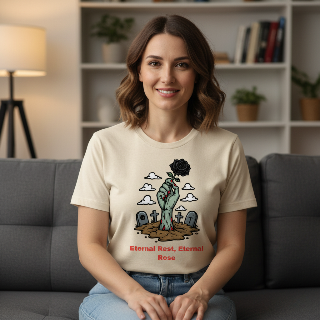 There’s something hauntingly beautiful about a black rose in the grip of the undead. Whether you’re a Halloween lover, a horror fan, or someone who embraces gothic vibes year-round, this tee lets you show off your unique style with a touch of spooky romance. It’s not just a shirt — it’s a statement of eternal love, darkness, and mystery.